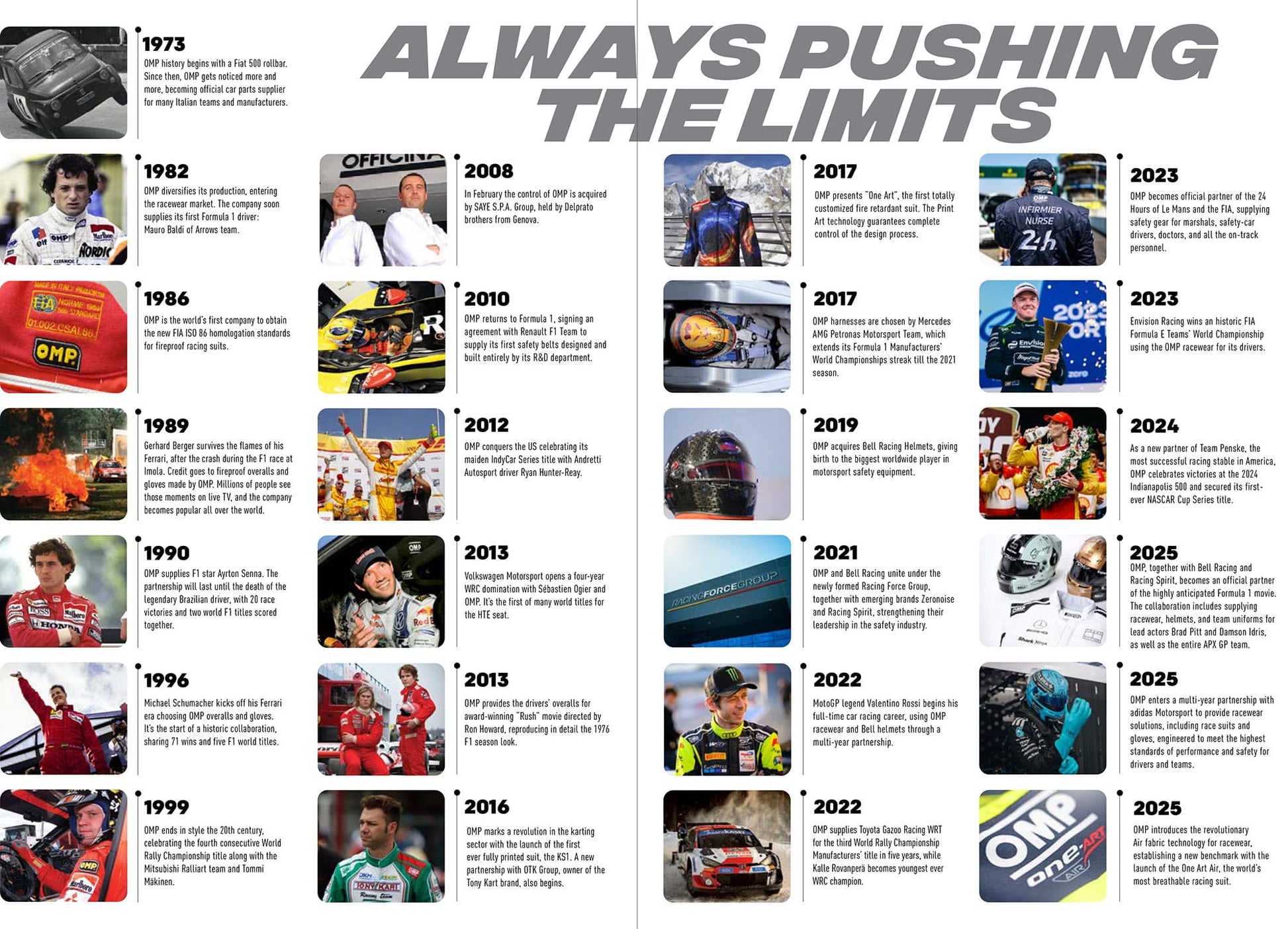 OMP products are used in Formula 1, Rally, Karting, Race and Touring Car Championships, whilst top racing drivers from all around the world rely on OMP racewear in international motorsport competitions.